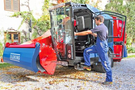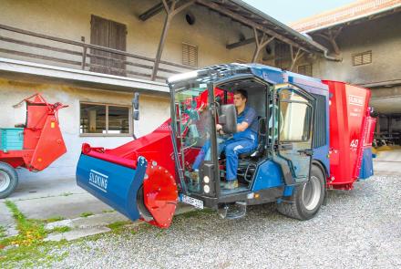 Optimális gép mind a hagyományos, kisüzemi vagy családi gazdaságok, mind a különböző teljesítménycsoportokkal rendelkező nagy telepek részére. Keskeny és alacsony istálló bejáratokhoz is kitűnő választás. A kompakt kialakítás a könnyen manőverezhető 3-pontos alvázzal lehetővé teszi a kétoldali takarmánykiosztást a takarmányon történő áthajtás nélkül.