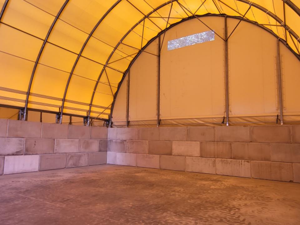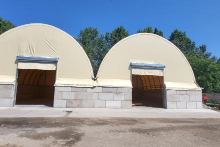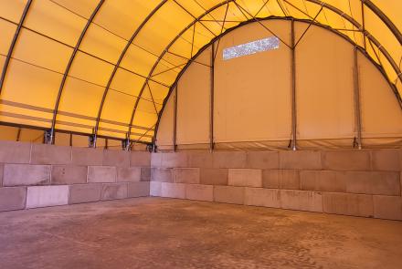 Ebben az esetben a sátrat 3-5 sor magasan épített 80x80x160-as Gravetti blokkokra szereljük, melyek önsúlya 2500 kg/db. Helykihasználás szempontjából ez a jobb megoldás, de egyben ez a legkevésbé biztonságos is vízbefolyás szempontjából. Itt a Gravetti blokkok tetejére építjük a sátrat, a víz bejutását, a blokkok alá rakott ragasztó habbal, a blokk és a betonlemez találkozásánál betonjavító anyagból készült „holkerrel”, és szükség szerint a blokkok külső oldalának ponyva borításával oldhatjuk meg. Összességében ez a legbonyolultabb, legköltségesebb megoldás, de bizonyos üzemméret és felhasználási cél, ezt a technológiát igényli.